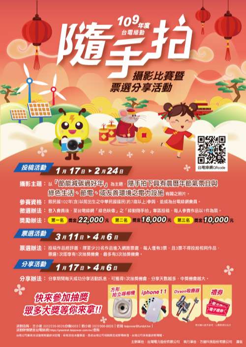 台灣電力股份有限公司自109年1月17日至109年2月24日止辦理「台電綠動隨手拍攝影比賽暨票選分享活動」,歡迎踴躍參加。