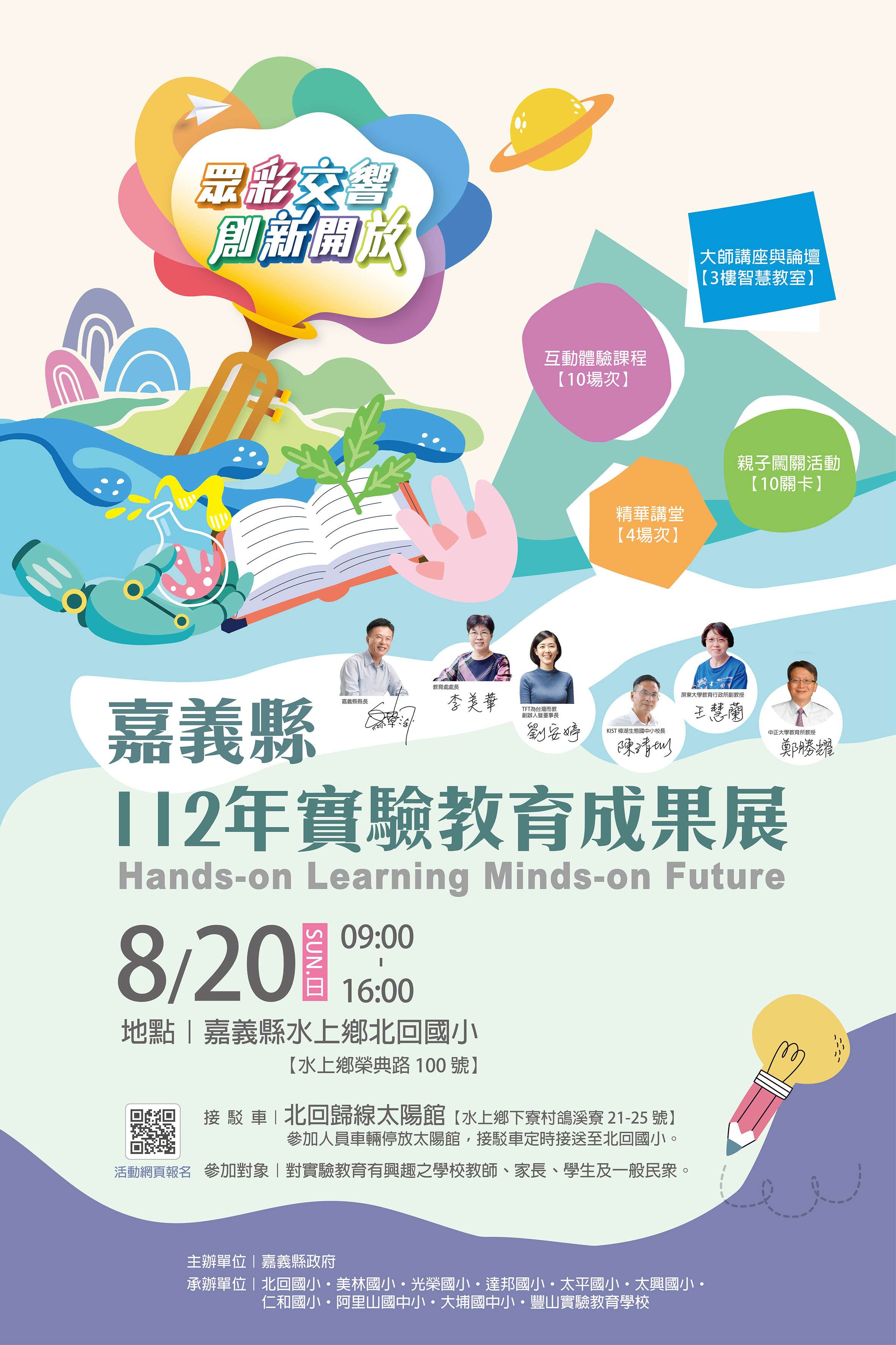 為讓各方教師、家長、學生了解本縣實驗教育樣貌,結合本縣學校型態及公辦民營實驗教育學校辦理者,規劃動態、靜態及互動式之成果展覽,讓各界認識嘉義縣實驗教育。邀請專家學者針對實驗教育之多樣態,剖析教育的彈性、創新及無限可能性,讓有興趣的學生及教師有機會加入實驗學校行列,家長更認識教育的多元樣貌。有興趣之師生可下載附件─活動計畫書及海報詳閱。