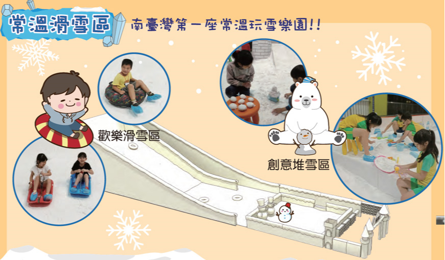 1、冰原世界:設有吊橋、雪丘、拱橋、隧道攀爬、螺旋滑梯等冰原主題之設施,在透明拱橋裡還可俯看冰川滑梯。
