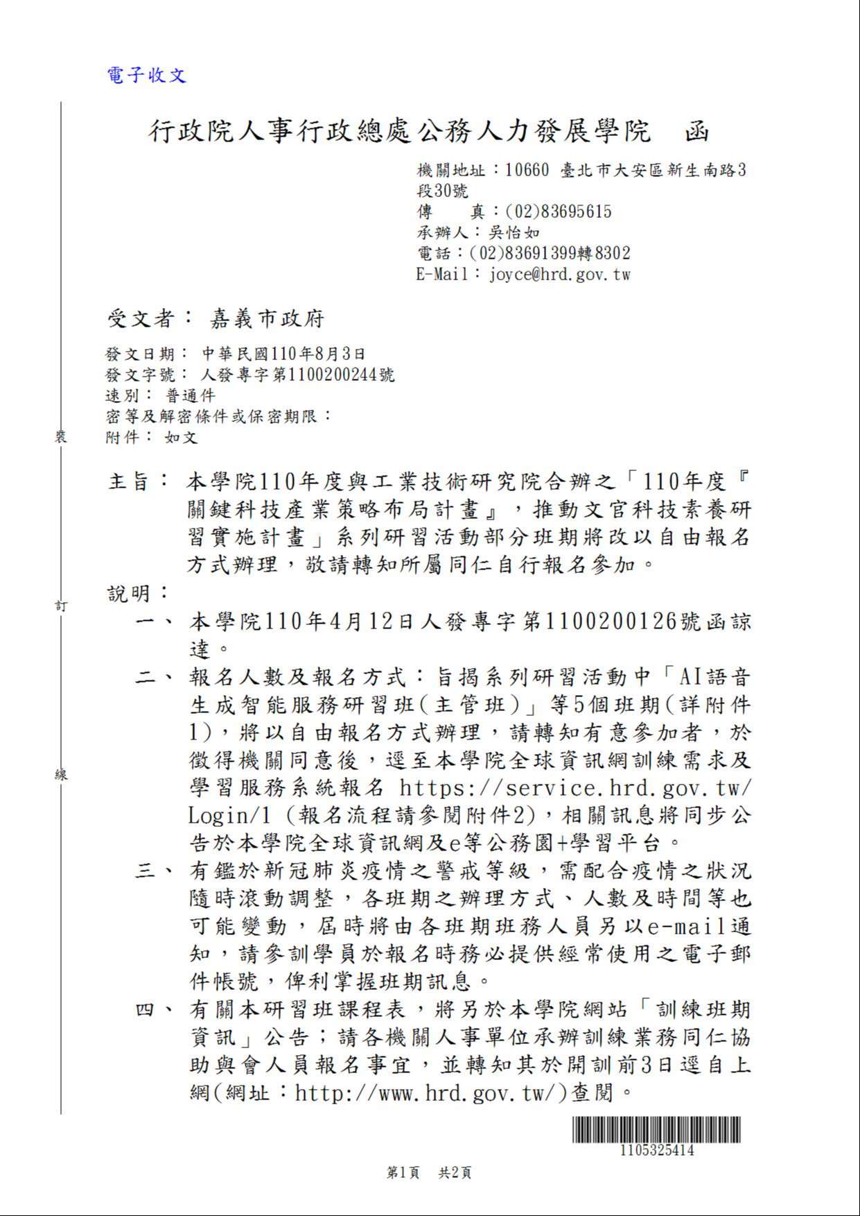 一、行政院人事行政總處公務人力發展學院與工業技術研究院合辦「110年度『關鍵科技產業策略布局計畫』,推動文官科技素養研習實施計畫」系列研習活動部分班期改以自由報名方式辦理,鼓勵所屬同仁自行報名參加,如獲錄取,以公假登記參訓。