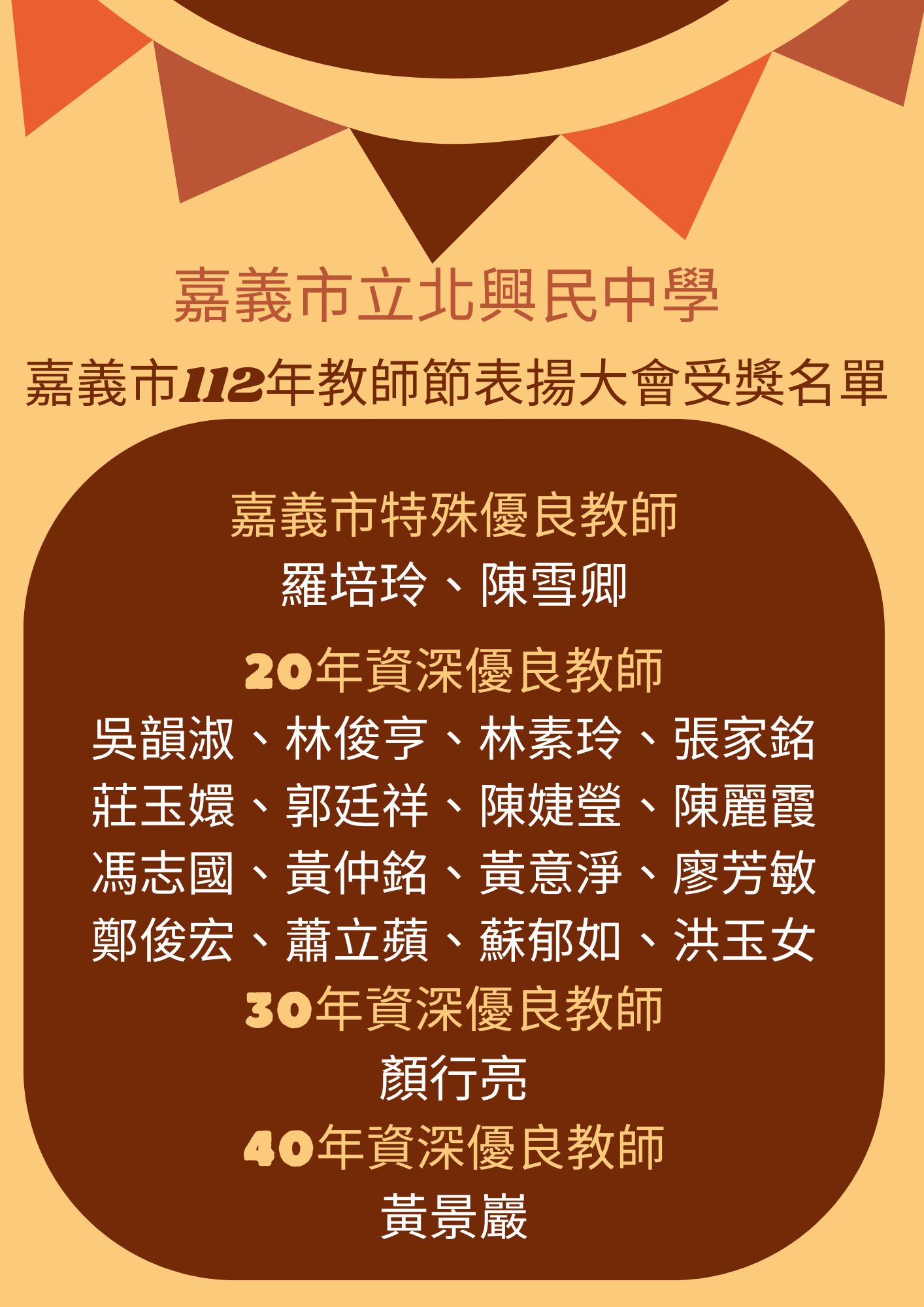 恭喜以上受獎教師,112年教師節表揚大會訂於112年9月22日(週五)上午於本校活動中心辦理,請於8/21前回傳112表揚大會教師簡介簡報資料至人事室信箱csy.psjh@mail.psjh.cy.edu.tw,以利彙整。