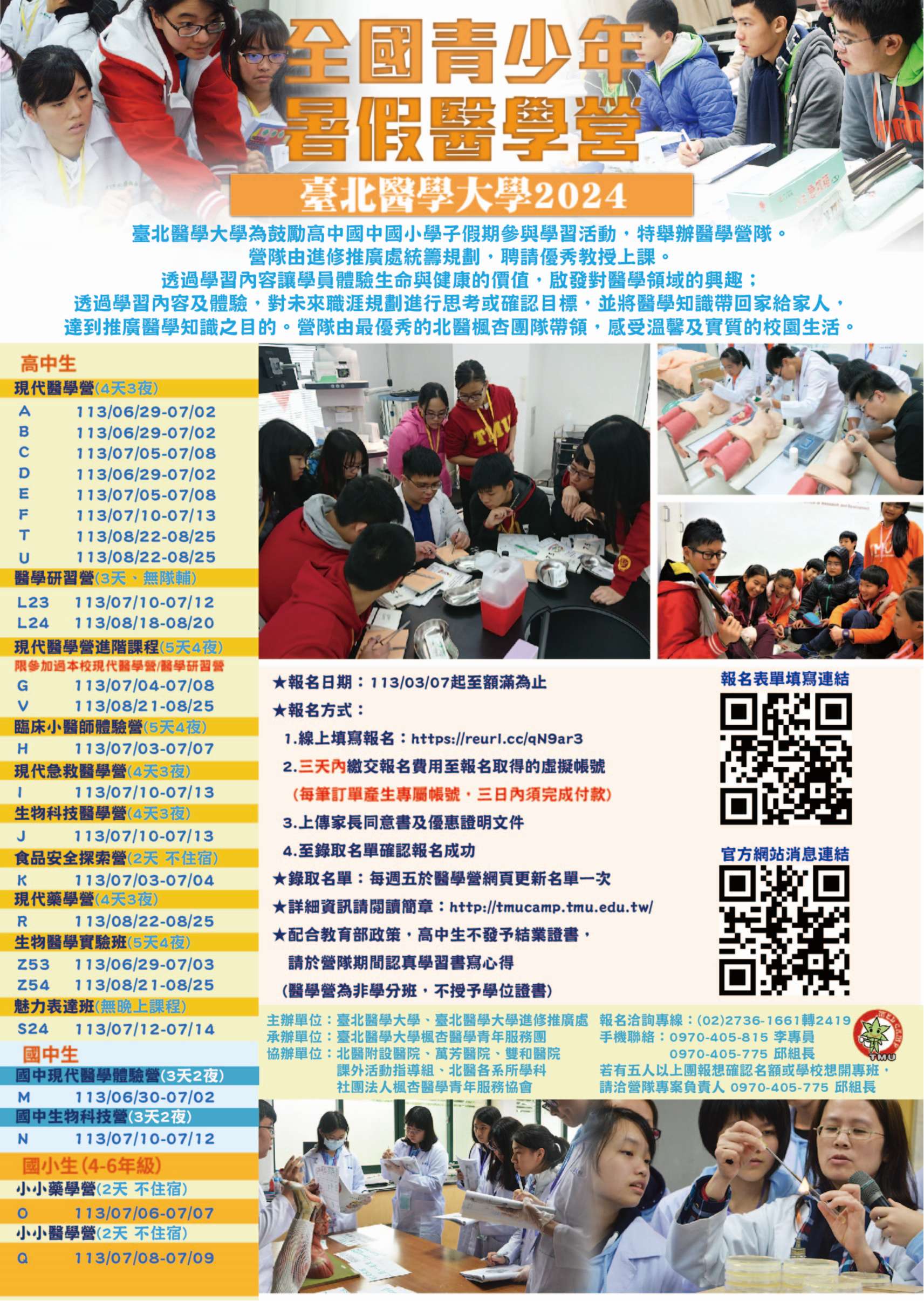 二、營隊資訊:2024暑期醫學營擬訂於民國113年6月29日至8月25日辦理。網址 http://tmucamp.tmu.edu.tw/