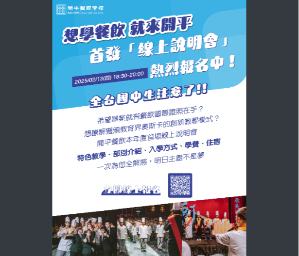 一、為使更多國中學生對技職教育深入瞭解,本校並辦理「線 上理念說明會」,提供學生、家長認識本校教育理念與餐 飲教學特色,協助增進國中學生及其家長對職業類科升學 管道及學習內容之試探,期望開平優秀學子成為臺灣及國 際餐飲界之人才。 二、請貴校協助公告轉知,以利學生及家長報名,亦可至本校 官網(https://www.kpvs.tp.edu.tw/)查詢。 三、本校線上理念說明會辦理日程謹訂於114年02月13日(星期 四)1830-2000辦理,惠請貴校一併轉知所屬學生,歡迎有 興趣的同學及家長至: https://www.kpvs.tp.edu.tw /admission/application/ 線上報名;如有招生入學相關 疑問可來電洽詢本校聯合服務室(02)2755-6939分機211。