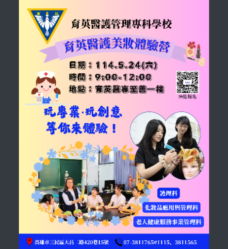 活動日期/時間:114年5月24日(星期六)9:00-12:10。 地點:高雄市三民區大昌二路420巷15號(本校至善樓1 樓)。報名網址:https://forms.gle/Uw16maKbR3QobPAr5,亦可 至本校網站首頁重要公告連結報名。 活動海報及議程如附件。 如有相關問題,請電洽本校教務處綜合業務組07 3811765#1115或1120。